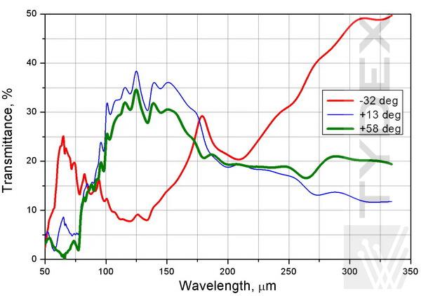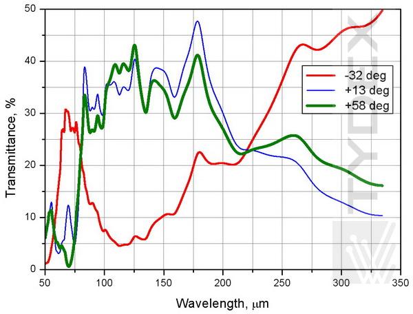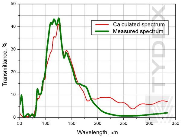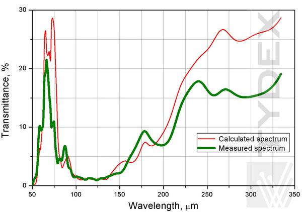 1. TWPC作为半波单色板,适用于80-160μm范围内的任何波长。TWPC作为120 μm半波片进行了测试。图1显示了使用平行偏振器计算和测量的TWPC透射光谱的比较。在120 μm处几乎为零的透射率证实了在所选波长处的适当偏振转换。