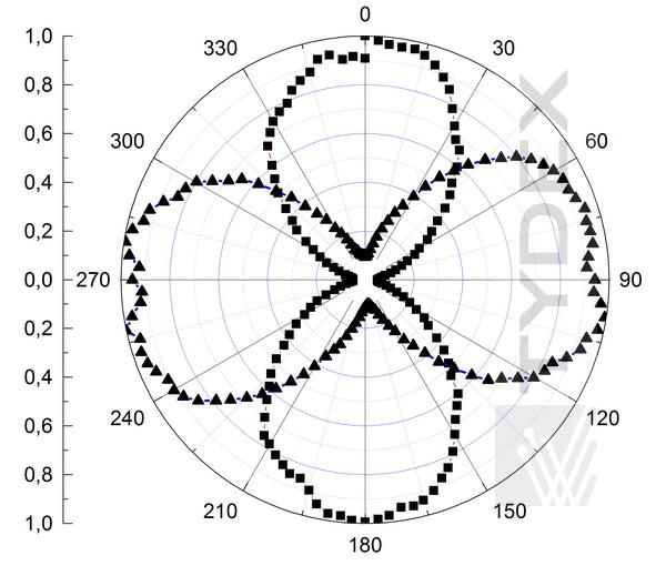AWP L/4@60-95um的光学特性已在雷根斯堡大学(德国)太赫兹中心使用高功率脉冲NH3激光器在77um和90um进行了研究。 垂直偏振激光辐射以及通过AWP的圆偏振激光辐射被测量为分析仪旋转角度的函数。 典型测量信号如图6所示。与理想O形和8形的偏差不超过10%。 这些图表证实了线偏振辐射到圆偏振辐射的正确转换,反之亦然。