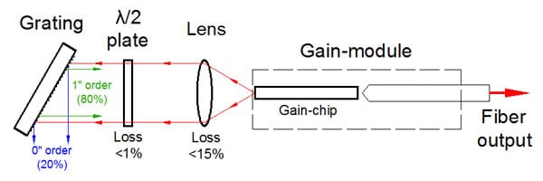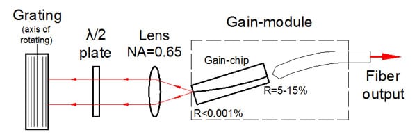 该设备包括带有弯曲条纹的“C型”增益芯片。条纹倾斜的刻面专为外部反馈而设计,并具有深层 AR 涂层,从而使芯片波导的背反射极低。它确保了自激的阻断,并消除了在外腔系统中操作时与复合腔相关的问题。这导致在整个调谐范围内具有高边模抑制比 (SMSR) 的非常精细的谱线。